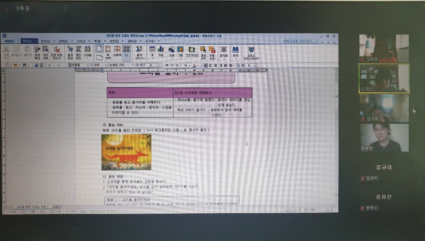 ‘꼬리를 돌려 주세요’는 미국의 어린이도서관협회에서 주관하는 그림책의 노벨상이라 불리는 칼데콧 상을 수상한 노니 호그로지안의 그림책으로_한 여우가 자신이 몰래 마신 우유 때문 꼬리를 잃고 꼬리를 되찾기 위한 과정을 재미있게 그린 과정에서, 자신이 한 행동에 대해서는 자신이 책임을 져야한다는 교훈을 주는 따뜻한 색감의 유아들의 참 좋아하는 그림책입니다. 3장에서 학습한 아동문학의 이론적접근 중 '로젠플랫의 독자반응이론에 기초한 그림책 읽기 활동 방법 및 질문 내용'을 적용하여, 유정이(2학년)가 교사가 되어 그림책을 보여주며 구연하고, 저를 포함한 나머지 친구들이 만 5세 유아가 되어 상호작용해 보는 재미있는 시간이었습니다. 그림책을 들어본 후 그림책에 대한 생각나누기를 하고, 표상하기를 통해 '정보추출적 관점'과 '심미적 관점'에서 이야기 나누어 보았는데요, 이러한 경험은_ 개정 누리과정의 아동문학교육 목표에 제시되어 있는 것처럼_ 유아가 다양한 책에 관심을 가지고 상상하며, 동화에서 말의 재미를 느끼고, 말놀이와 이야기 짓기를 즐기는 경험을 주며, 예비유아교사인 여러분들에게는 교재에서 배운 이론적 지식을 실천적 지식으로 적용하여 문학수업 시 중요한 교사로서의 역량을 쌓는 소중한 경험이 되었을 것입니다('칼데콧 상'의 의미와 '로젠플랫의 독자반응이론'은 임용고시에도 자주 출제가 되는 내용입니다) * 동물은 유아들이 참 좋아하는 주제인데요, 유아들이 동물에 관심과 흥미를 보일 때, 반원 모양으로 둘러 앉게 한후 자연스럽게 읽어 주어도 좋겠고, 자기중심적인 성향이 강하고 조망수용능력이 부족한 유아들에게 자기행동에 대해 책임을 져야 함을 알려주고 싶을 때, 이처럼 수업을 계획하여 적용해 주어도 좋겠습니다.