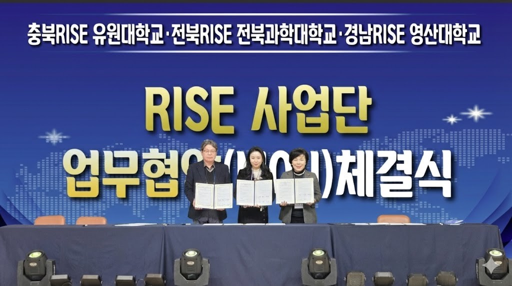 유원대학교(총장 정현용) 충북 RISE사업단은 2월 2일 영동군복합문화예술회관에서 영산대학교 RISE사업단, 전북과학대학교 RISE사업단과 함께 지역대학 연계 지·산·학·연 협력 강화를 위한 업무협약(MOU)을 체결했다.