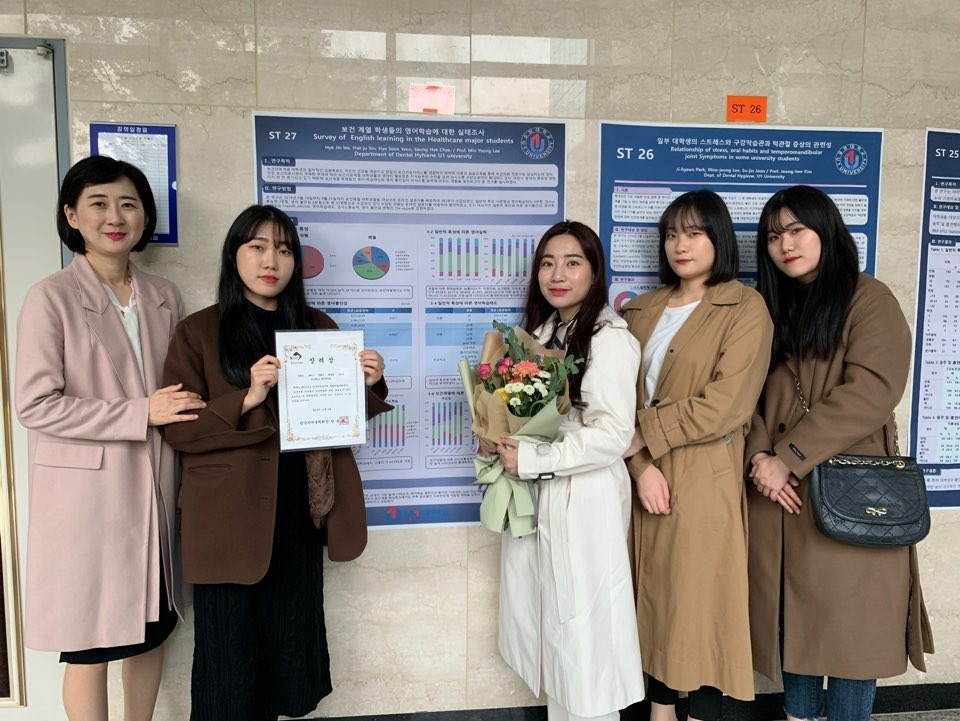 지난 11월 2일(토) 3,4학년 학생들은 ‘2019 한국치위생학회 종합학술대회'에 참석 하였습니다. 우리학교는 이번 학술대회 학생 포스터 경진대회에 4학년 5개 팀이 참여하여 ‘장애인 구강보건교육 자료에 대한 실태조사’라는 주제로 '김주희, 김희연, 정예연, 지도현'(지도교수 유자혜) 팀이 대상을 수상하였으며, 이외에도 '이혜진, 연혜선, 채승희(지도교수 이민영)', '박지현, 이우정, 전수진'(지도교수 김정희) 팀이 장려상을 수상하는 좋은 결과를 얻었습니다. 이에 대상을 수상한 우리학교는 학생 포스터 경진대회에 참여한 전국의 치위생학과 약 40여개팀을 대표하여 구연발표를 하였습니다. 우리학교 치위생학과가 앞으로도 꾸준히 치위생학 발전에 기여하며 학교를 빛내기를 바랍니다^^