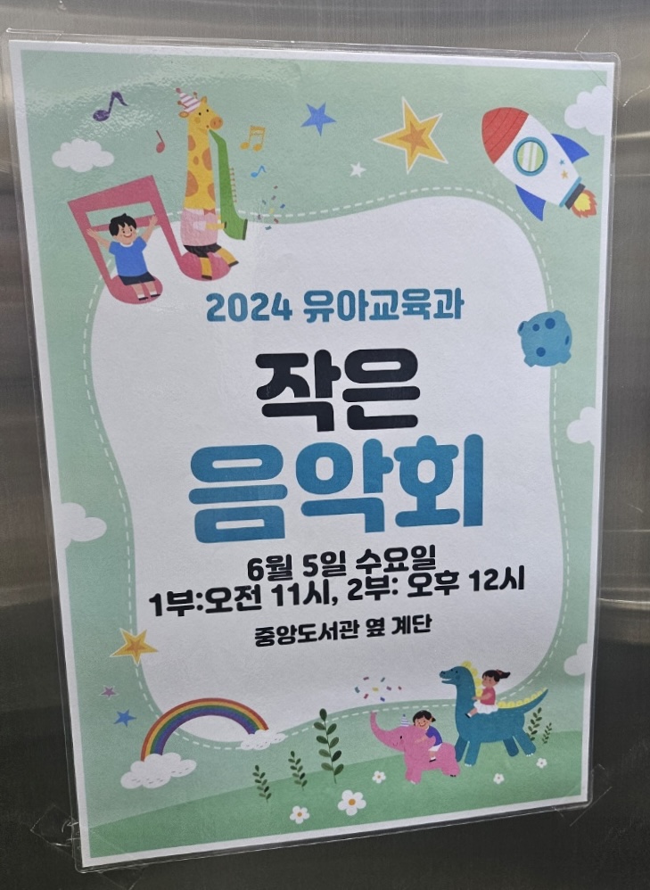 신나는 콰이강의 다리 연주를 시작으로, 유아들이 좋아하는 동요(상어가족, 뽀로로, 바나나 차차, 타요, 폴리), 스토리 뮤직(미운오리새끼, 개미와 베짱이), 카혼 연주 등 다양한 곡으로 1 ,2부 2회에 거쳐 진행되었습니다. 작은 음악회는 재학생 모두와 교직원 및 지역민들에게 의미있는 문화예술적인 체험을 제공하는 역할을 하며, 예비영유아교사들의 감성과 소양을 기를 수 있는 소중한 경험이 되었습니다.