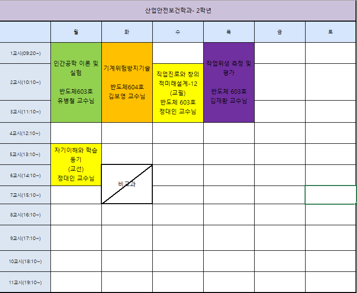 산업안전보건학과 2023학년도 2학기 2학년 시간표 입니다.